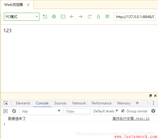 <!DOCTYPE html> <html lang="zh"> <head> <meta charset="UTF-8"> <meta name="viewport" content="width=device-width, initial-scale=1.0"> <meta http-equiv="X-UA-Compatible" content="ie=edge"> <title>Document</title> </head> <body> <div>123</div> <script> // 執(zhí)行事件步驟 // 點擊div 控制臺輸出 我被選中了 // 1. 獲取事件源 var div = document.querySelector('div'); // 2.綁定事件 注冊事件 // div.onclick // 3.添加事件處理程序 div.onclick = function() { console.log('我被選中了'); } </script> </body> </html>