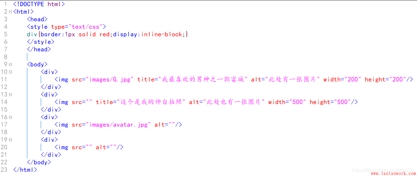 如果圖片路徑引用錯(cuò)誤,都會(huì)導(dǎo)致網(wǎng)頁中的圖片無法正常顯示! 如,第 14 行和第 20 行代碼。
