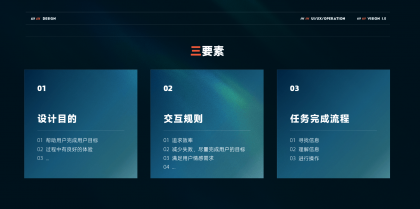 這里說的三要素分別為 設計目的、交互規(guī)則、完成任務過程。(三要素的定義說明都以簡單化的去舉例,主要展示整體的思維方法)