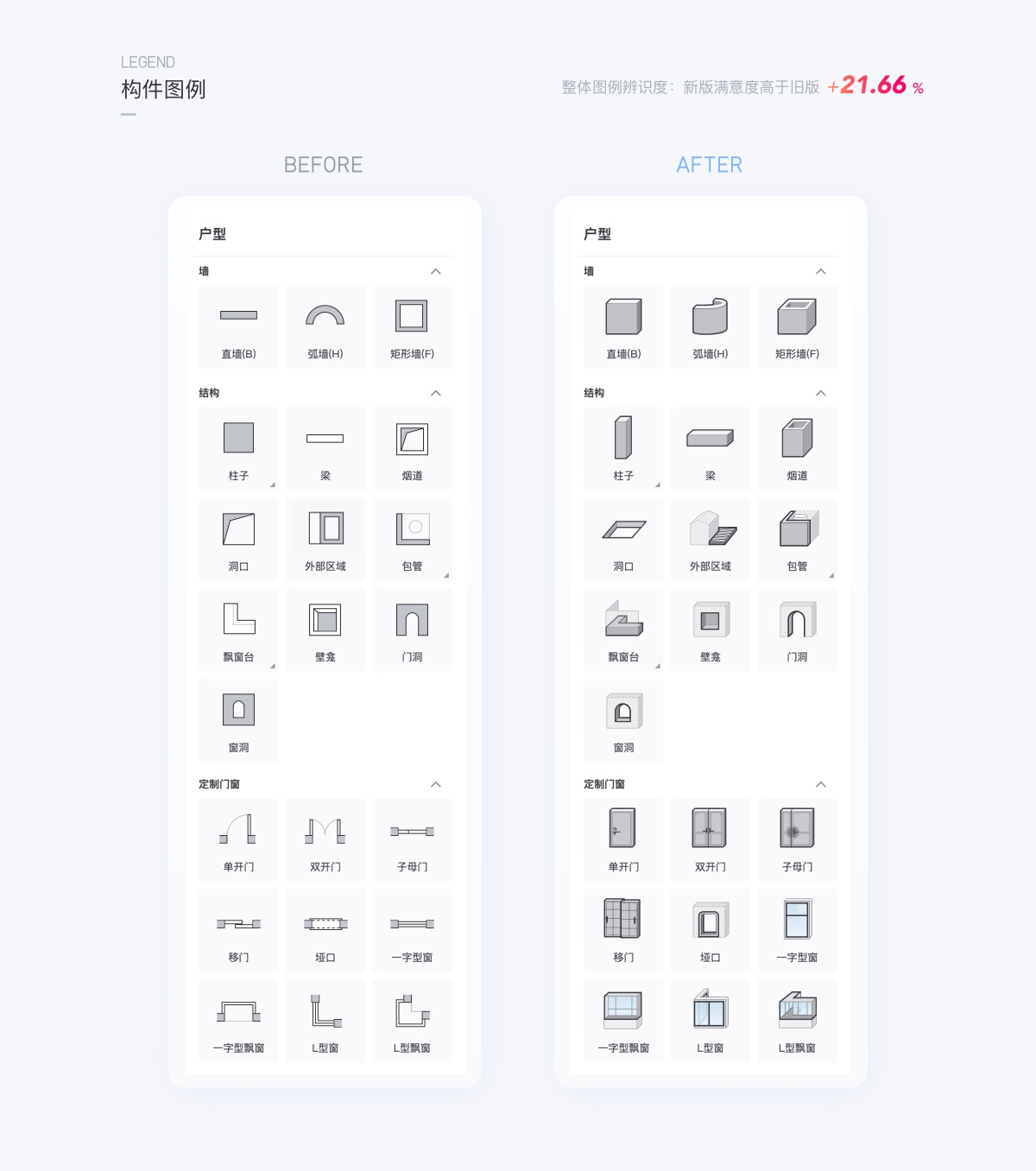 上線后通過問卷調研用戶滿意度相比舊版提升了21.66%,因此可以證明,更精準的圖形輔助用戶更高效的使用工具操作。以上是項目小組在試驗過程中的部分案例,不再一一列舉所有的試驗案例,可以看到信息表達的精準度、直觀度是能夠對業(yè)務產(chǎn)生直接的正向結果,鑒于群核下的工具產(chǎn)品有大量的應用圖標圖例,借此我們重新排查和校準了很多圖標,確保表達相對精準,提高用戶信息識別的精準度與效率。