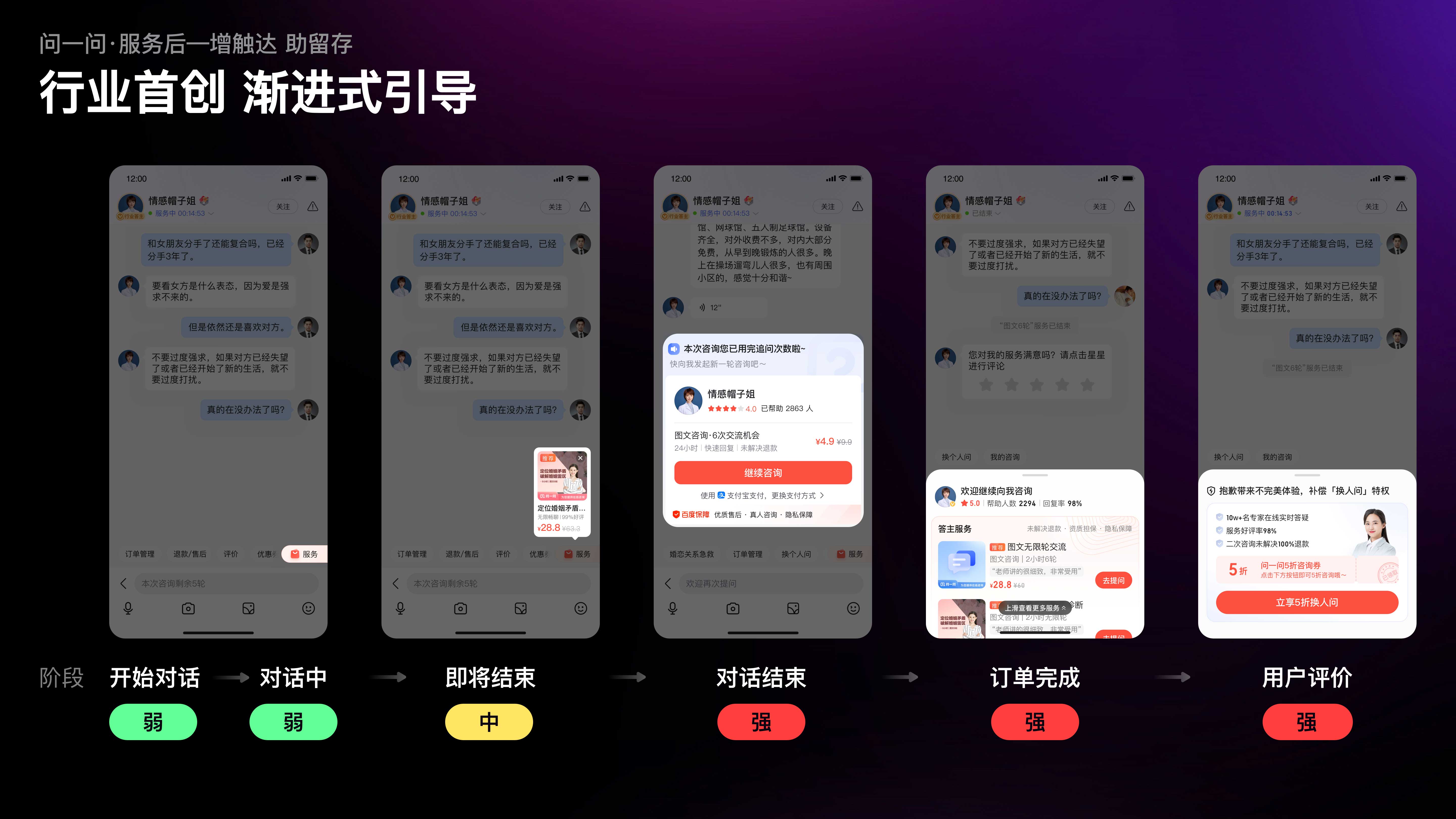 當(dāng)我們以用戶視角,遍歷咨詢鏈路中的復(fù)購(gòu)引導(dǎo)時(shí),發(fā)現(xiàn)復(fù)購(gòu)引導(dǎo)的觸點(diǎn)覆蓋不足,且缺少對(duì)特定場(chǎng)景下需求的識(shí)別,例如在咨詢開(kāi)始時(shí)復(fù)購(gòu)需求極弱,但設(shè)計(jì)引導(dǎo)極強(qiáng);而在隨后的對(duì)話過(guò)程中需求漸增,但引導(dǎo)缺失。因此,我們制定了行業(yè)首創(chuàng)的漸進(jìn)式引導(dǎo)策略;隨著服務(wù)推進(jìn),復(fù)購(gòu)需求漸增,觸達(dá)強(qiáng)度也逐級(jí)遞進(jìn)。