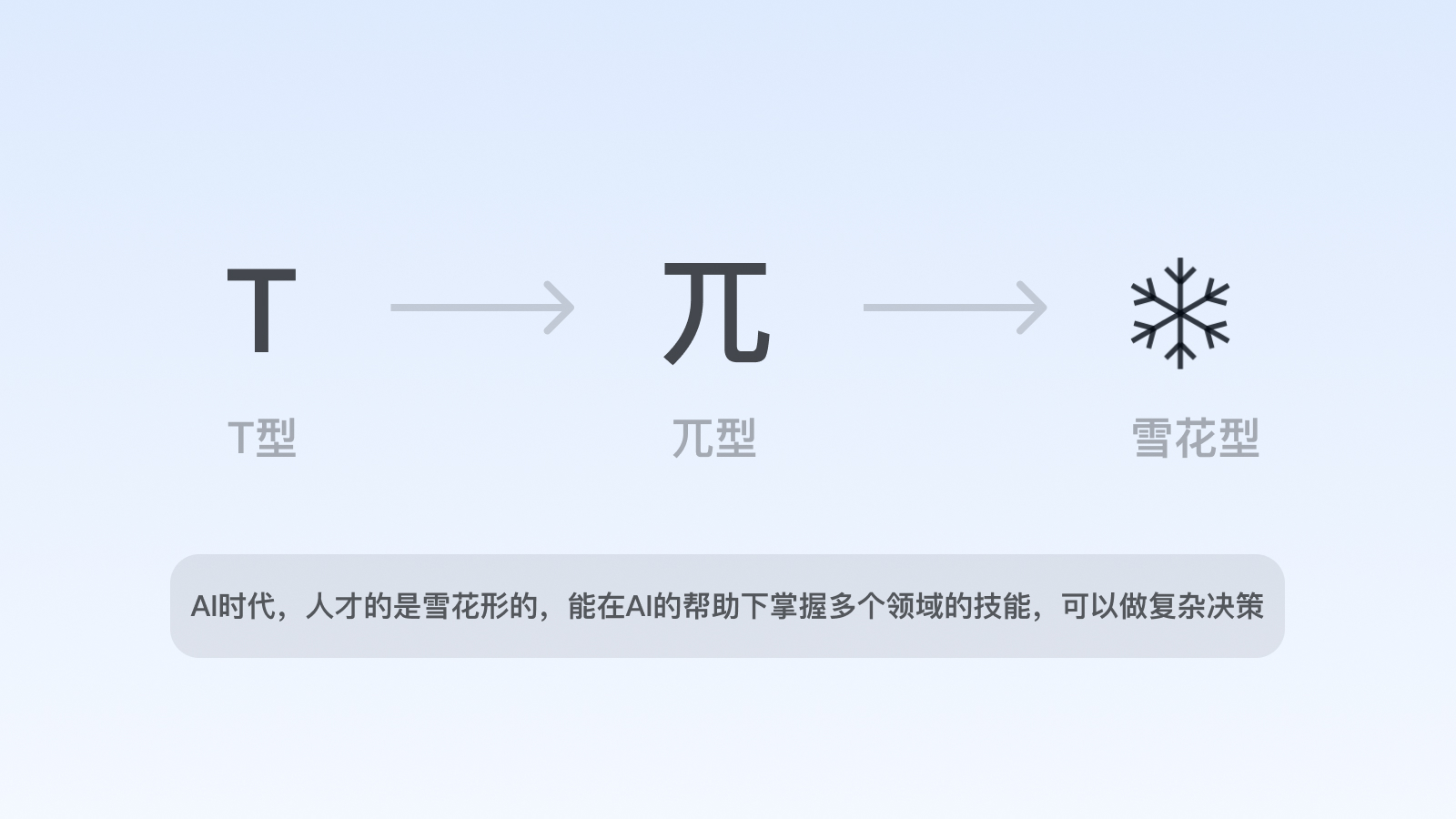 在人工智能時代,部分重復(fù)性、初級的設(shè)計需求將被替代,設(shè)計師乃至互聯(lián)網(wǎng)職場人的能力維度將隨之會有所改變,善用AI的綜合能力素養(yǎng)變?yōu)閯傂?,在能力維度上接近于“雪花型”。