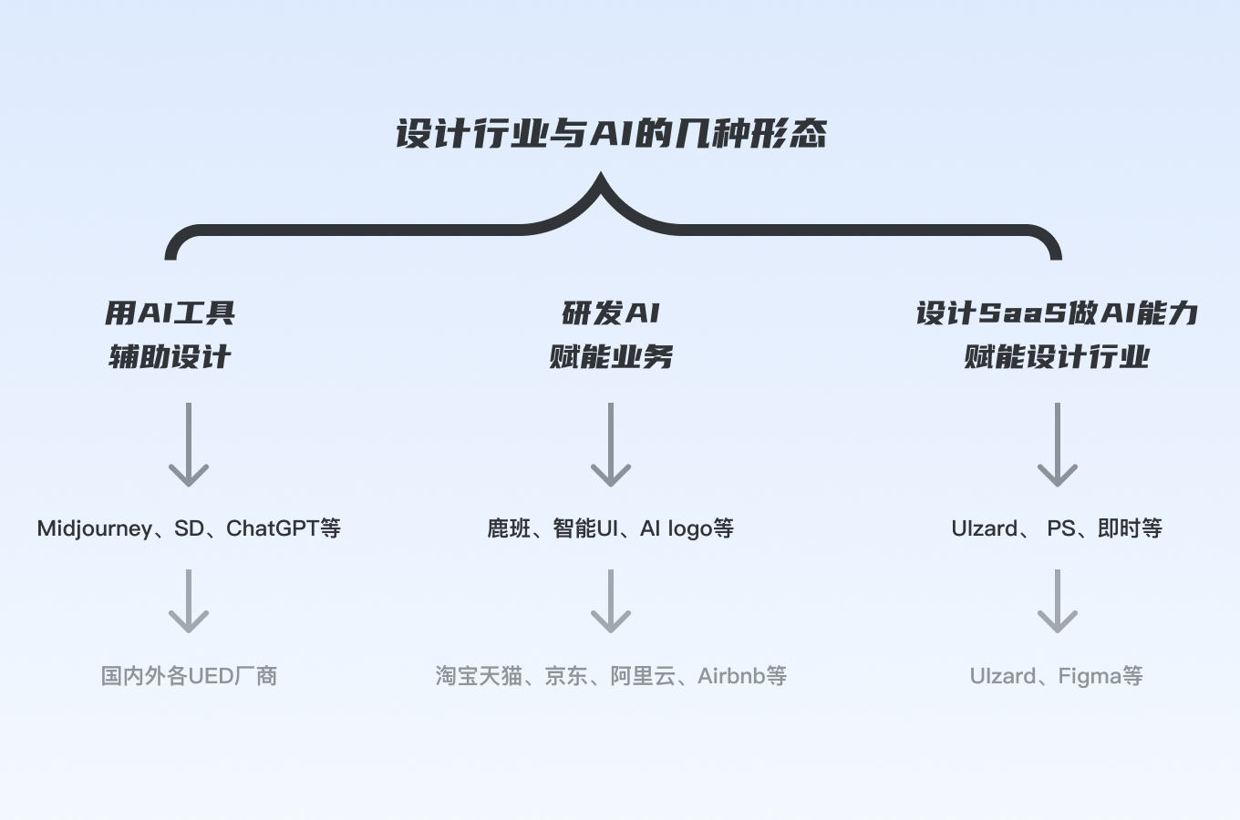 這里不涉及設(shè)計作為UI、UX接相關(guān)AI業(yè)務(wù)需求的場景,目前主要的關(guān)系是用AI工具輔助設(shè)計,設(shè)計驅(qū)動研發(fā)AI賦能業(yè)務(wù)在部分大廠有,非常稀缺,設(shè)計SaaS賦能行業(yè)總體來講玩家數(shù)量有限,這里不再贅述。