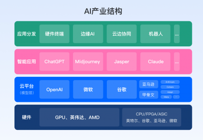 硬件、云平臺(模型層)、智能應(yīng)用、應(yīng)用分發(fā)構(gòu)成了AI整個產(chǎn)業(yè)鏈條,站在產(chǎn)業(yè)格局的角度看,算力很重要、硬件卻并非關(guān)鍵。這輪變革最大的機(jī)會在應(yīng)用層面,所以大量涌現(xiàn)出智能應(yīng)用,比如ChatGPT、Midjourney;以及各行各業(yè)基于大模型對AI能力接入,提升自己產(chǎn)品力或服務(wù)能力。