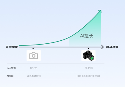 不考慮思考過程時間消耗,將人工手繪和AI繪制對比,AI可能無法穩(wěn)定的繪制靠左的相機(jī)圖形,但可以很快、較穩(wěn)定的繪制右邊的相機(jī),而人去繪制右邊相機(jī)可能需要至少一天時間,還不一定有AI效果好。