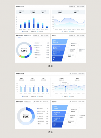原圖中的圖表應(yīng)用有一定的問(wèn)題,第一個(gè)柱狀的堆疊類型并不是太符合實(shí)際數(shù)據(jù)應(yīng)用,下方的環(huán)形圖中起始位置顯然不對(duì),并且色彩比較混亂。