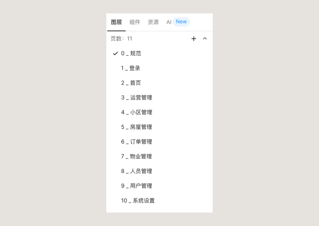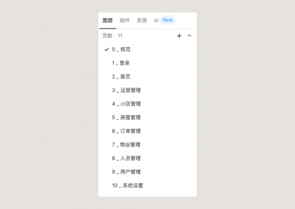 Page 就是軟件左上的畫布列表,一個項目如果頁面多,就一定要用 Page做拆分。而在我們當(dāng)前的場景中,就可以根據(jù)交付的模塊階段劃分,每個模塊創(chuàng)建一個 Page,這樣開發(fā)在本次項目中只需要查看這個源文件就可以。