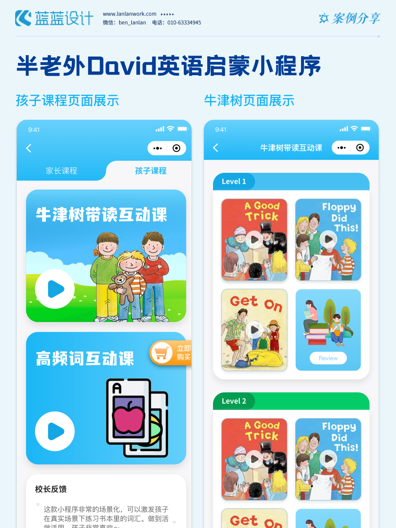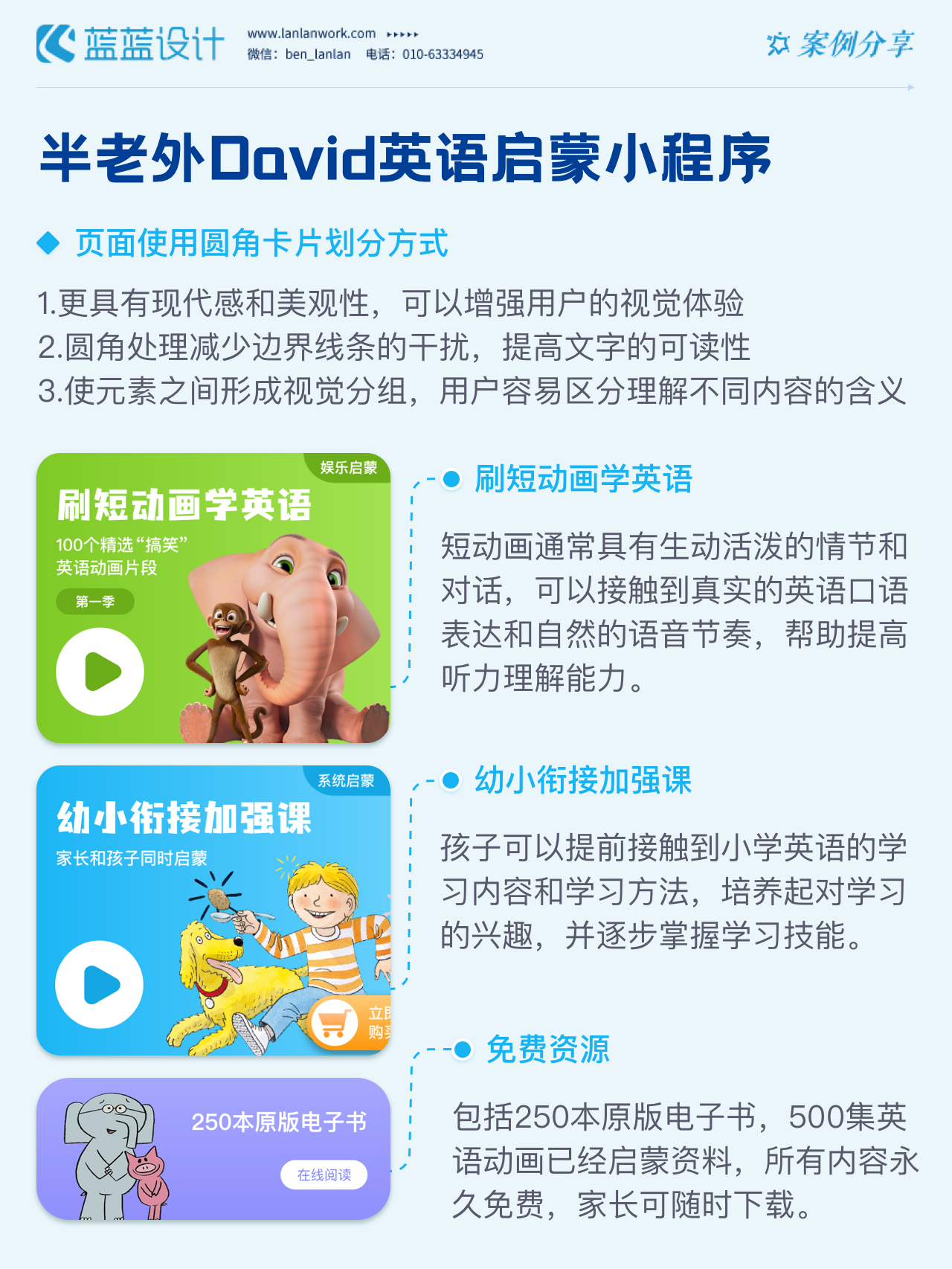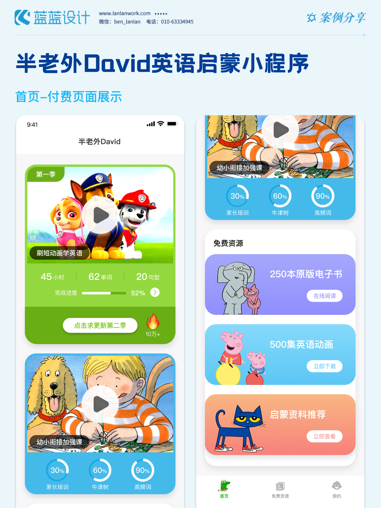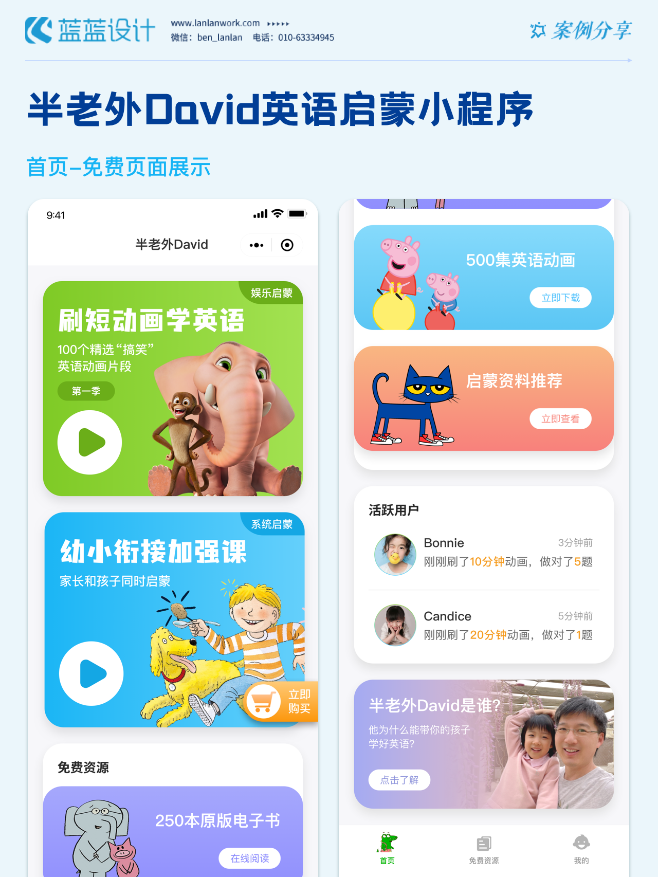 藍(lán)藍(lán)設(shè)計負(fù)責(zé)半老外David英語啟蒙小程序的界面整體風(fēng)格和細(xì)節(jié)優(yōu)化工作,也包括圖片優(yōu)化等諸多視覺內(nèi)容。前期雙方通過不斷溝通和深入了解最終確定了頁面的風(fēng)格樣式??匆曨l學(xué)英語的方式更容易為孩子所接受,頁面的簡潔風(fēng)格和顏色應(yīng)用更加吸引兒童。