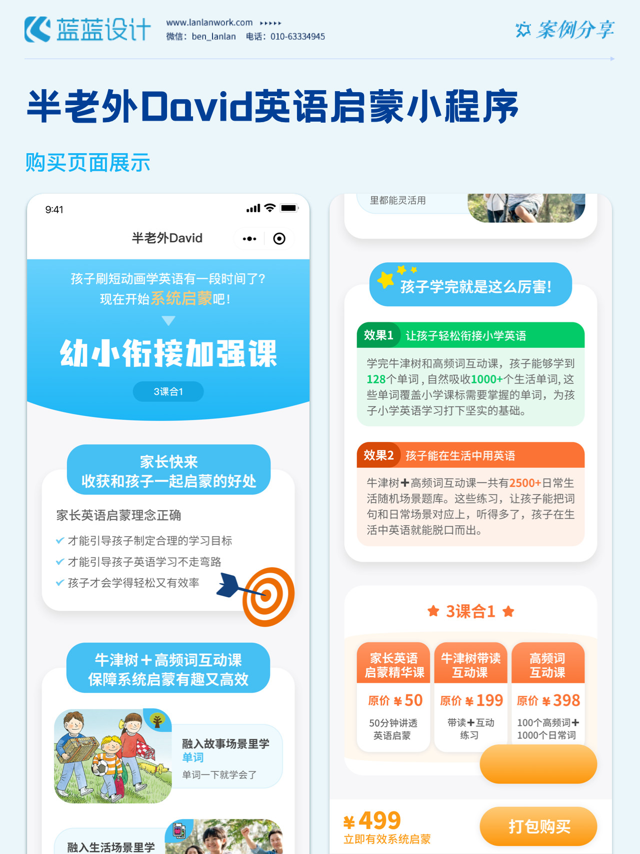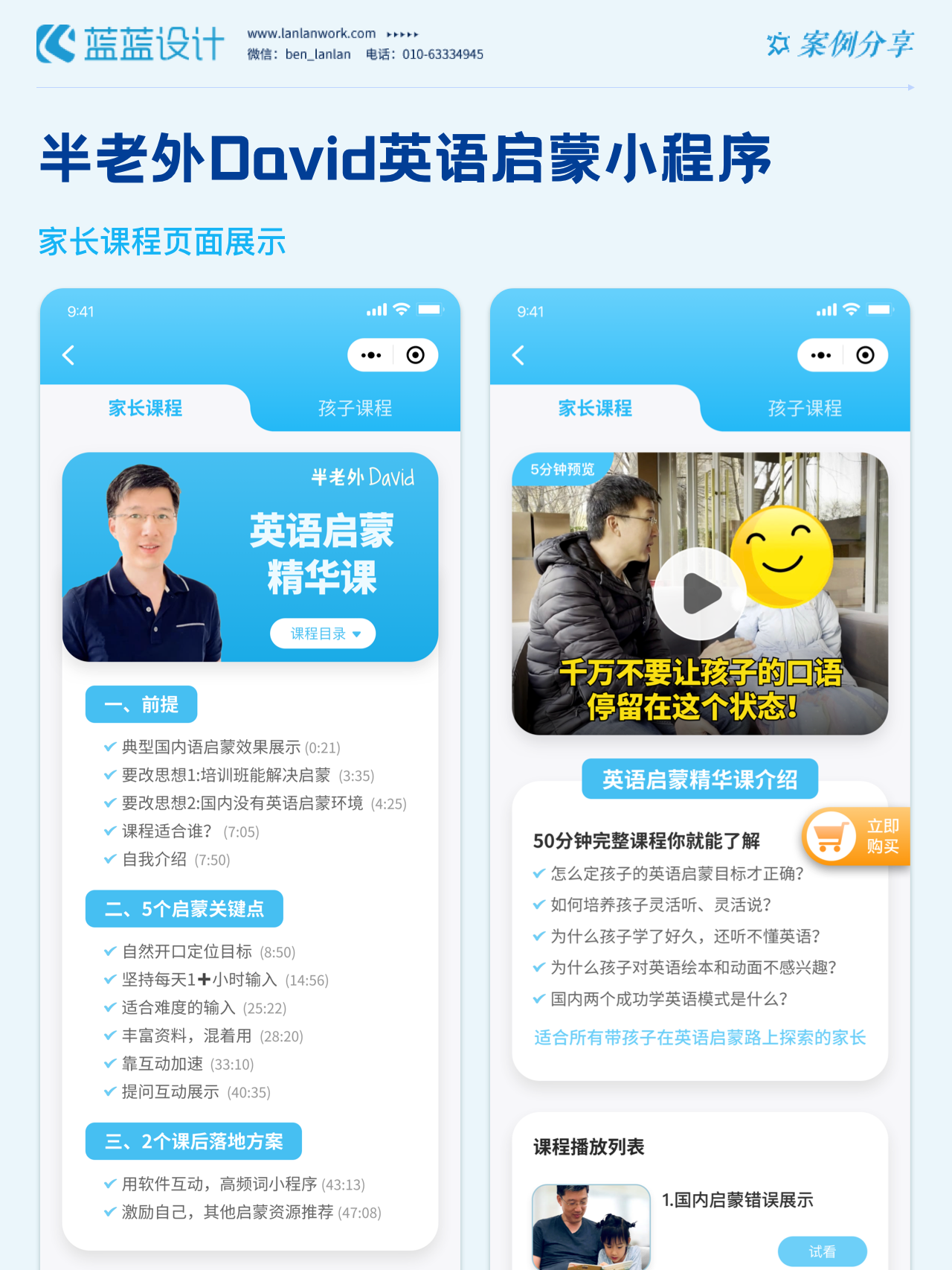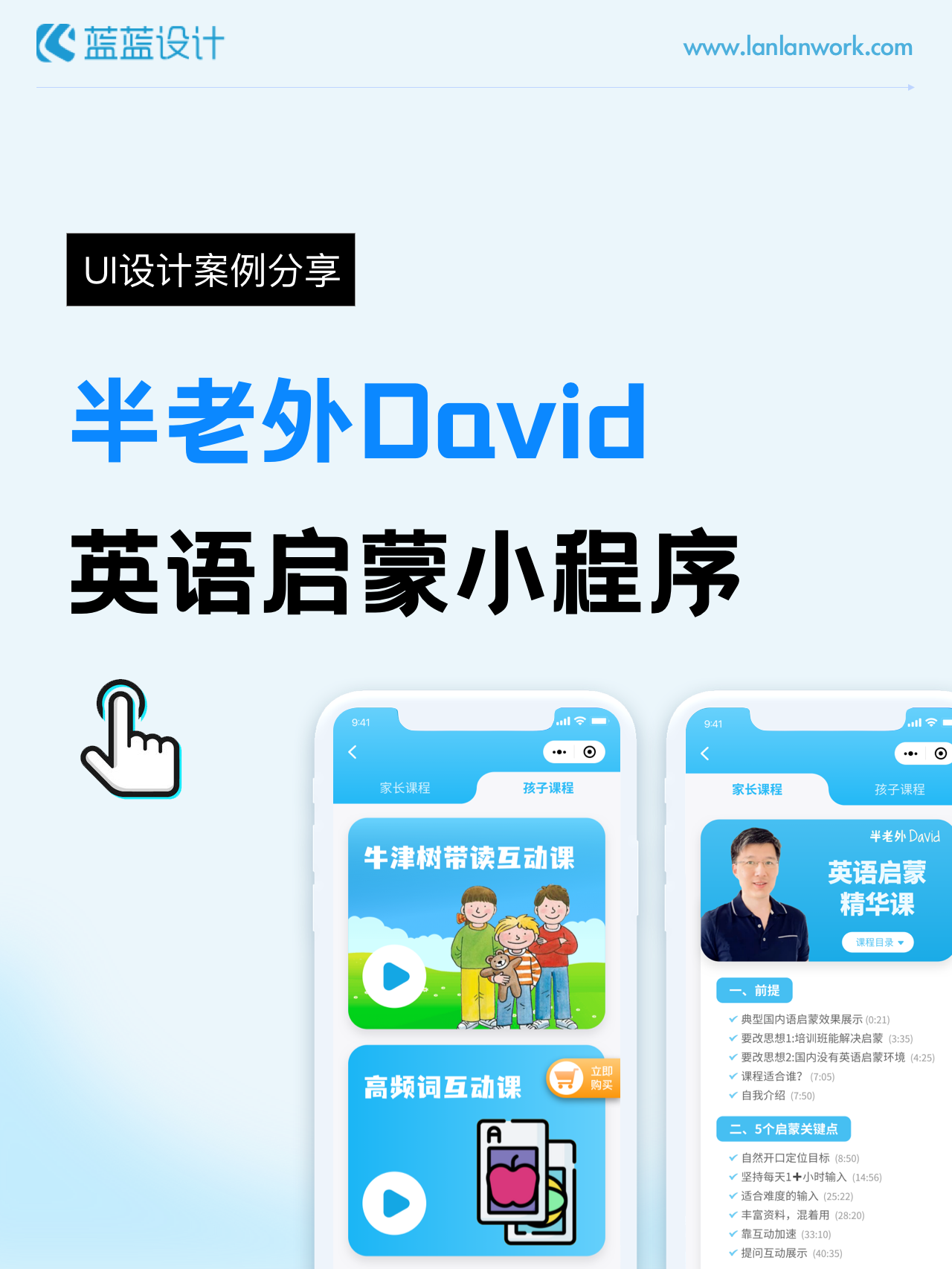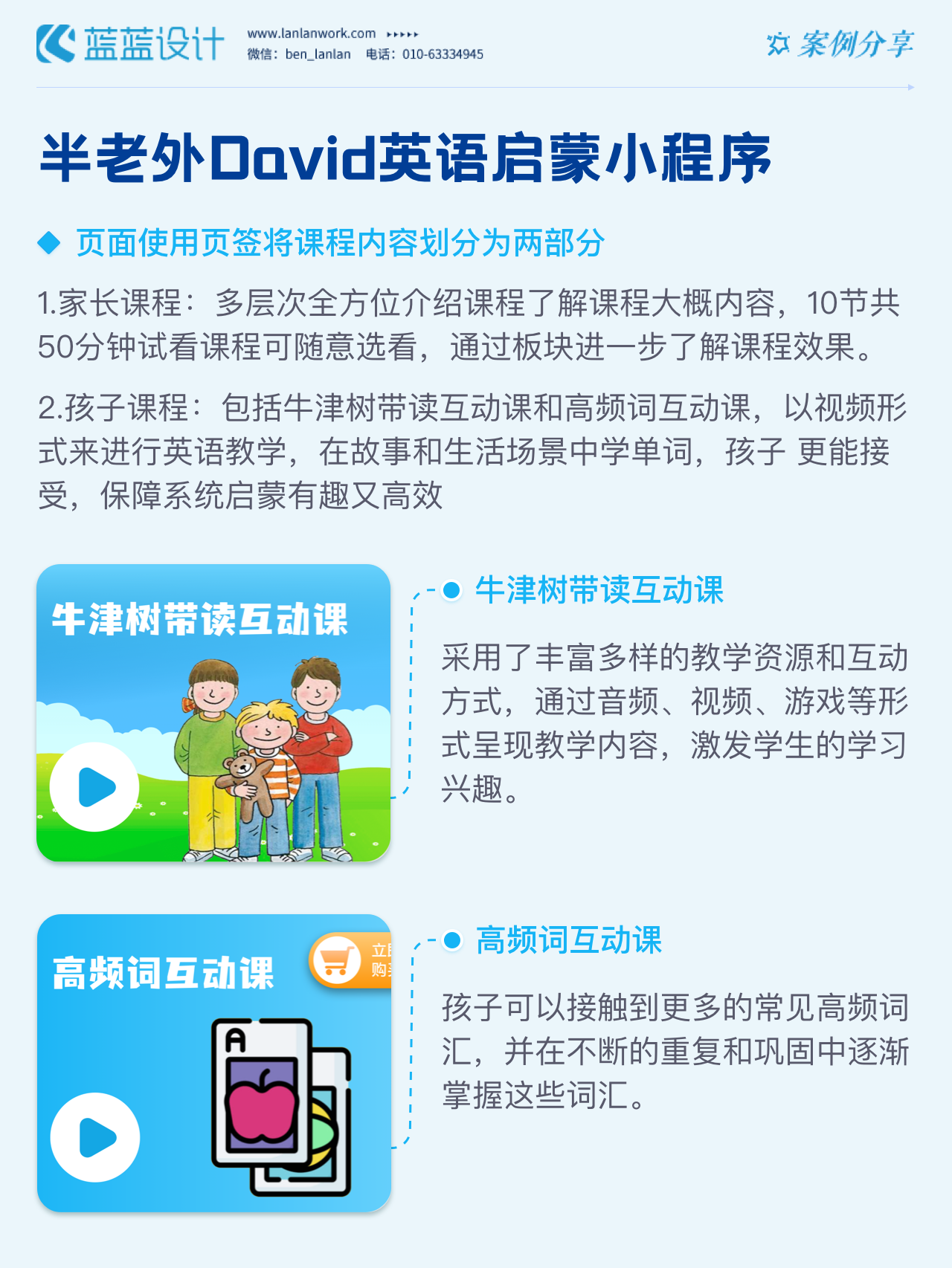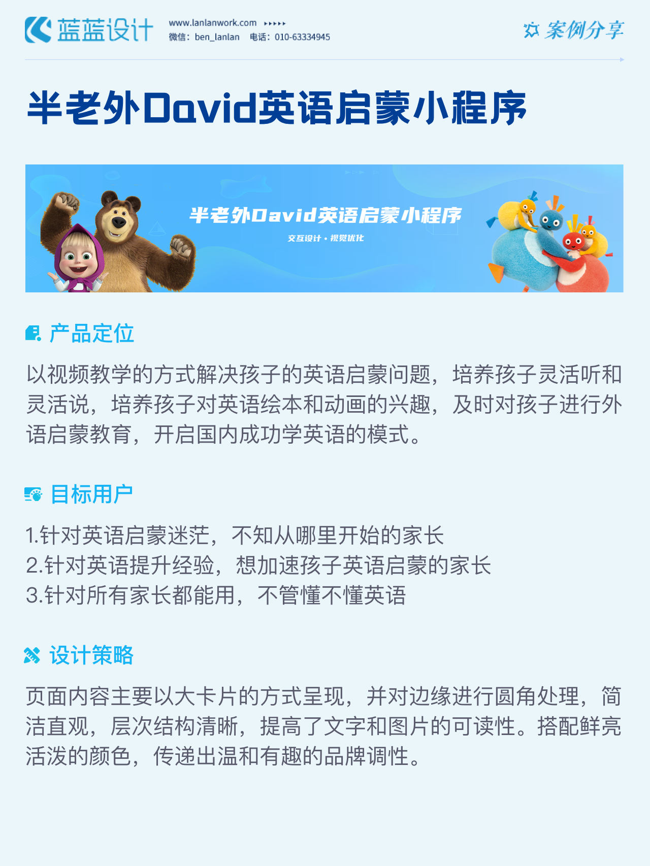 藍(lán)藍(lán)設(shè)計負(fù)責(zé)半老外David英語啟蒙小程序的界面整體風(fēng)格和細(xì)節(jié)優(yōu)化工作,也包括圖片優(yōu)化等諸多視覺內(nèi)容。前期雙方通過不斷溝通和深入了解最終確定了頁面的風(fēng)格樣式??匆曨l學(xué)英語的方式更容易為孩子所接受,頁面的簡潔風(fēng)格和顏色應(yīng)用更加吸引兒童。