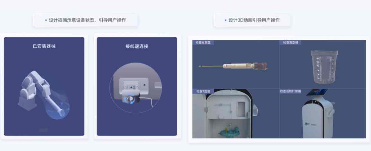隨著科技的飛速發(fā)展,人工智能(AI)正悄悄改變醫(yī)療健康行業(yè),為其帶來前所未有的數(shù)字化轉型。未來,醫(yī)療健康行業(yè)將迎來個性化、精準化、智能化的新時代。設備操作界面是醫(yī)師操控機器人的窗口,操作界面設計易用、直觀、美觀度直接影響到醫(yī)療機器人的使用效果和產品的品牌價值。人性化的操作界面可以提高操作者的工作效率和操作的舒適度,降低操作的學習成本和出錯率,提高手術精準度和手術成功率。在UI設計中,我們結合真實的使用場景,加入插畫和建模動畫的設計,引導醫(yī)護人員進行操作,從而使操作更加直觀易用,提高工作效率。