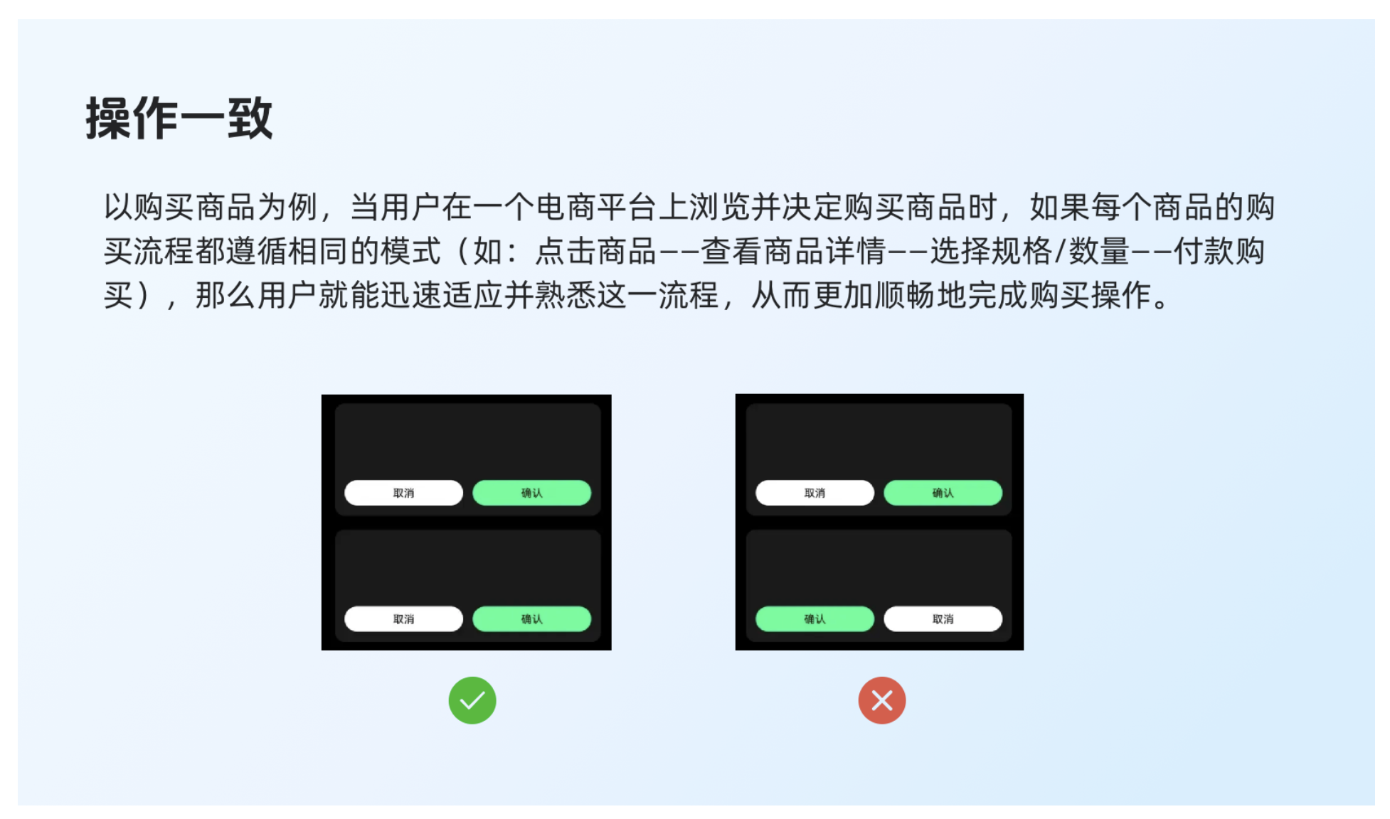 :確保用戶在執(zhí)行相似任務(wù)時(shí),如購(gòu)買商品、搜索信息或提交表單等,能夠遵循相同的操作流程。這有助于用戶快速適應(yīng)并高效完成任務(wù)。