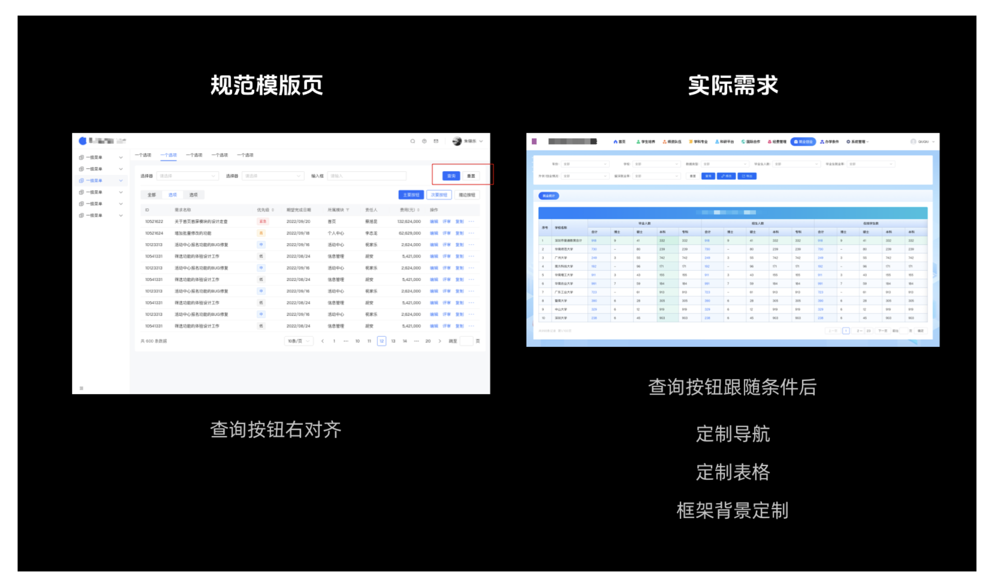 相對(duì)于彈窗,頁面的空間更大,邊界感偏弱,用戶的視覺重心更容易停留在左側(cè)表單內(nèi)容區(qū)域。所以按鈕應(yīng)該緊隨搜索條件,便于用戶快速發(fā)現(xiàn)按鈕。