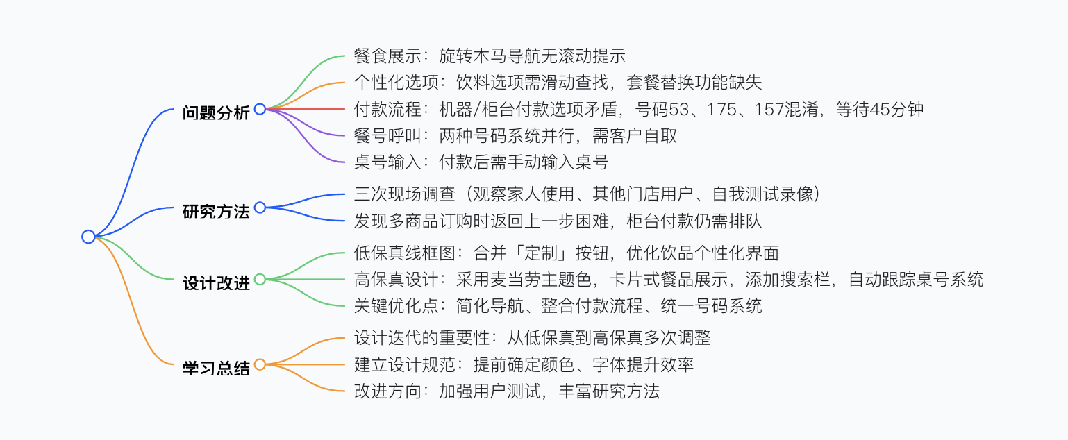 本文圍繞麥當(dāng)勞自動點餐系統(tǒng)的用戶體驗展開分析,指出其在餐食展示(無滾動提示)、個性化選項(需手動滑動才能看到更多)、付款流程(存在 53、175、157 三個混淆號碼,導(dǎo)致 45 分鐘等待)、餐號呼叫系統(tǒng)(兩種號碼并行)、桌號輸入等環(huán)節(jié)存在問題。作者通過三次現(xiàn)場調(diào)查,基于用戶畫像和故事板構(gòu)建解決方案,經(jīng)低保真與高保真原型迭代,重新設(shè)計了菜單展示、個性化選項流程及付款系統(tǒng),最終強調(diào)設(shè)計中反復(fù)測試和建立規(guī)范的重要性。