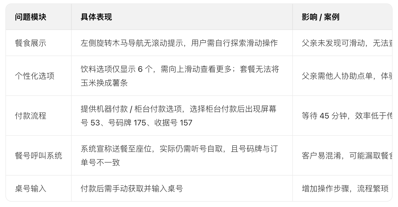 發(fā)現(xiàn)痛點:多商品訂購時返回上一步困難,柜臺付款仍需排隊等待收銀員。