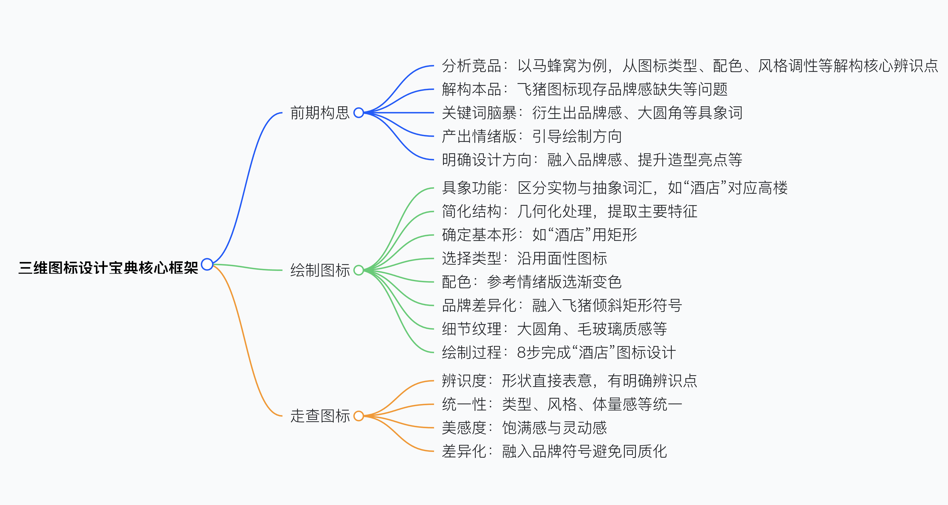 “三維圖標(biāo)設(shè)計(jì)寶典” 方法論,強(qiáng)調(diào)從前期構(gòu)思(分析競(jìng)品如馬蜂窩與本品飛豬的圖標(biāo)類型、配色、風(fēng)格及核心辨識(shí)點(diǎn),通過關(guān)鍵詞腦暴鎖定 “品質(zhì)、活力、青春” 方向并產(chǎn)出情緒版)、繪制圖標(biāo)(具象功能、簡(jiǎn)化結(jié)構(gòu)、確定基本形,融入飛豬品牌超級(jí)符號(hào),添加毛玻璃質(zhì)感等細(xì)節(jié))到走查圖標(biāo)(從辨識(shí)度、統(tǒng)一性、美感度、差異化四方面檢查,如類型、風(fēng)格、體量感統(tǒng)一,融入品牌符號(hào)增強(qiáng)差異化)的完整流程,助設(shè)計(jì)師提升過稿率。
