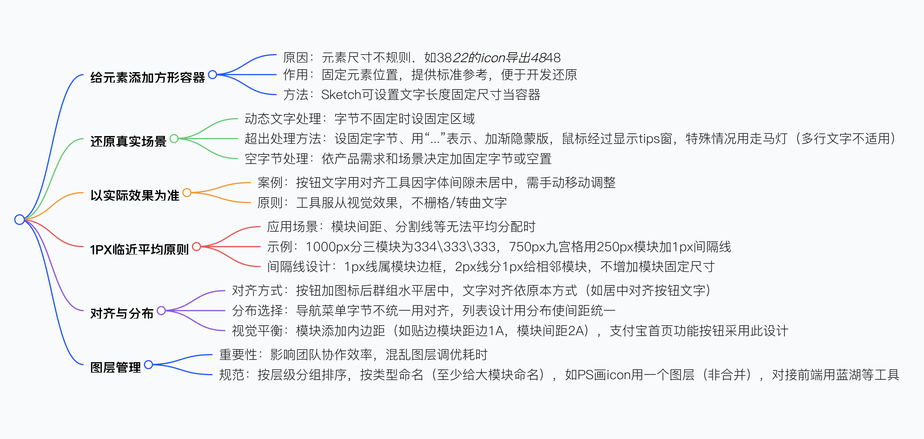 UI 設(shè)計需死摳細(xì)節(jié),包括給元素添加方形容器以固定位置方便開發(fā)還原,盡可能還原真實(shí)場景如處理動態(tài)文字字節(jié)用省略號、漸隱蒙版或 tips 窗,以實(shí)際效果為準(zhǔn)調(diào)整文字對齊(如手動移動解決字體間隙問題),遵循 1PX 臨近平均原則處理無法均分的尺寸(如 334\333\333 的分配),注意對齊與分布(如導(dǎo)航菜單按需求選擇對齊或分布方式并添加內(nèi)邊距實(shí)現(xiàn)視覺平衡),以及做好圖層管理(按層級分組命名以提高協(xié)作效率),這些細(xì)節(jié)體現(xiàn)設(shè)計師專業(yè)素養(yǎng)并提升設(shè)計質(zhì)量。