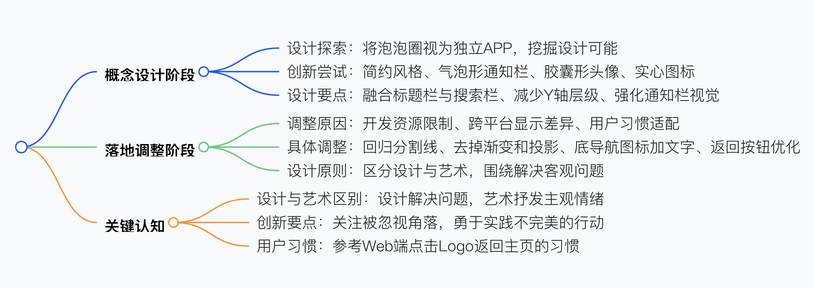 UI 設計思路應先放飛概念探索多種可能,如將泡泡圈視為獨立 APP 進行設計,嘗試簡約風格、氣泡形通知欄、膠囊形頭像、實心圖標等創(chuàng)新設計,再結(jié)合實際落實到產(chǎn)品,比如因開發(fā)資源和屏幕顯示限制去掉漸變和彌散投影、回歸分割線和返回按鈕,同時要明確設計與藝術(shù)的區(qū)別,設計需圍繞客觀問題解決,概念稿后要提取可用點推動落地,注重用戶習慣和跨平臺適配,像用愛奇藝 Logo 代替文字返回按鈕。