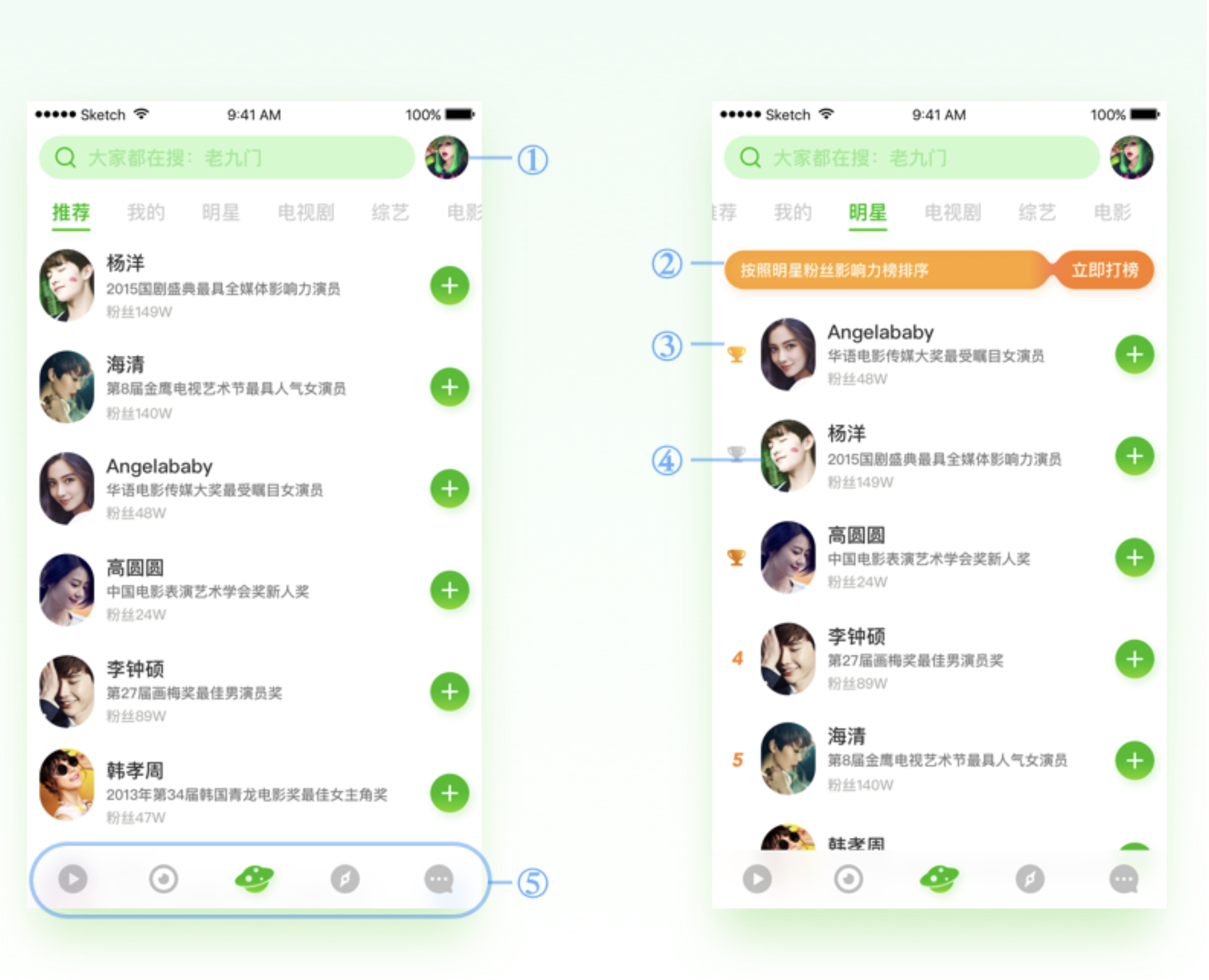 - 信息展示:明星圈簡介字段保留,布局與推薦頁一致;明星標簽頁將排序信息放列表左側(cè),不外露影響力分值等與排名相關(guān)信息,營造榜單氛圍。