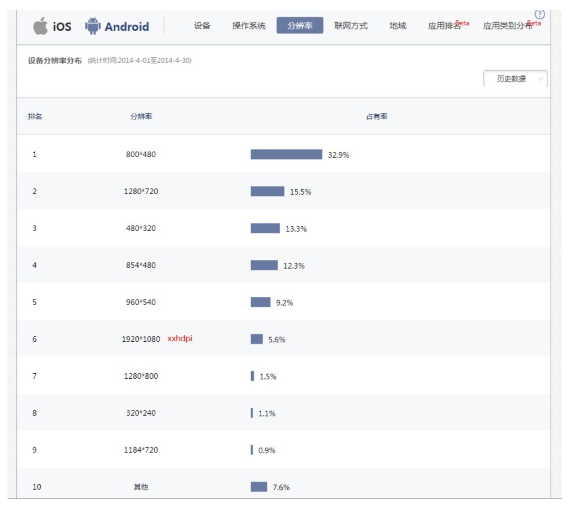 1. 分辨率選擇:綜合考慮適配效率和機(jī)型分布,建議從 xhdpi(720*1280)分辨率入手。因大分辨率內(nèi)容縮小適配性更好,且該分辨率能兼顧安卓的 mdpi、hdpi、xhdpi 及 iPhone 3G、iPhone 4 及以上機(jī)型,一定程度上可實(shí)現(xiàn)一套界面適配安卓和 iOS(雖兩者交互差異大,不建議完全共用界面)。