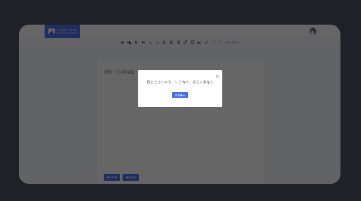 好用的 B 端產(chǎn)品能顯著提升用戶操作效率,讓工作如行云流水般順暢。反之,難用的產(chǎn)品就像用鈍刀切黃油,不僅效率低下,還會讓人心情煩躁。“人人都是產(chǎn)品經(jīng)理” 的文章投稿發(fā)布頁面設(shè)置了文章導(dǎo)入功能,支持從公眾號、簡書、知乎專欄導(dǎo)入文章,大大節(jié)省了投稿人編輯文本和排版的時間,減少了重復(fù)排版的麻煩,也提高了人們的投稿意愿。