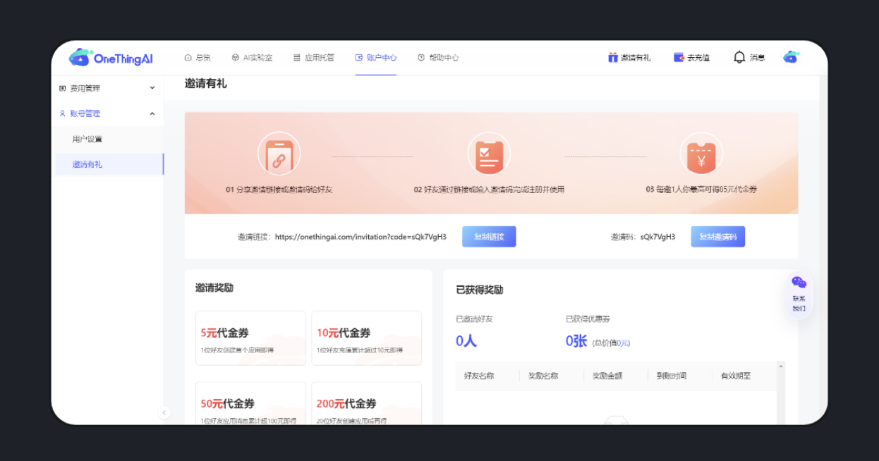 對于 SaaS 產(chǎn)品,在滿足業(yè)務(wù)場景的前提下,良好的體驗如同口碑的種子,會不斷生根發(fā)芽,讓更多人愿意付費并推薦給朋友,使產(chǎn)品像茁壯成長的樹一樣不斷吸引新養(yǎng)分。oneThingAI 推出的 “邀請有禮” 活動,會員推薦他人可獲得相應(yīng)代金券,再加上工具本身體驗好、便捷易上手,在優(yōu)惠活動期間,吸引了眾多 AI 愛好者注冊購買,有效促進了產(chǎn)品銷量增長。