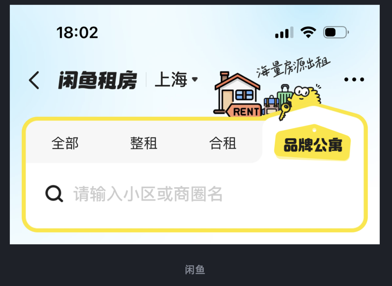 傳統(tǒng)租房板塊多以 “文字 + 普通卡片” 呈現(xiàn),用戶需先讀文字才能識別功能;閑魚則直接將 “房屋結(jié)構(gòu)” 轉(zhuǎn)化為視覺符號 —— 卡片上用簡化的房屋輪廓圖標(biāo)替代傳統(tǒng)標(biāo)簽,配合 “RENT” 英文標(biāo)識,讓用戶一眼就能關(guān)聯(lián) “租房” 業(yè)務(wù)。這種設(shè)計不僅強(qiáng)化了業(yè)務(wù)屬性,還通過圖形化降低了信息識別成本,同時獨特的視覺符號也加深了用戶對產(chǎn)品的記憶度。