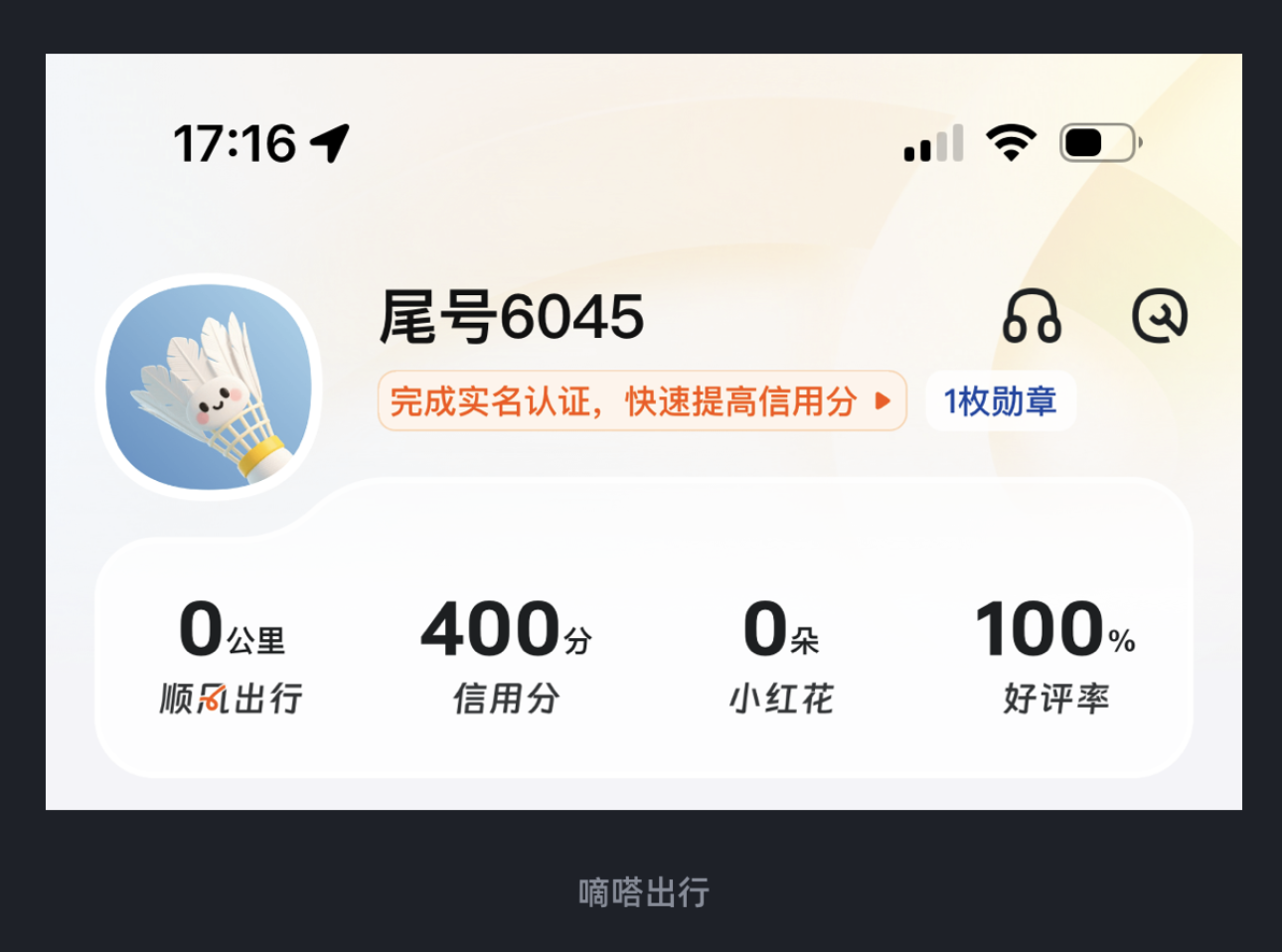 不同于傳統(tǒng)的圓形或方形頭像,嘀嗒采用 “超橢圓頭像”,并將其與個人信息卡片的左上角凹陷處精準(zhǔn)匹配 —— 頭像的邊緣與卡片凹陷完美貼合,仿佛 “嵌” 在卡片里。這種設(shè)計既突出了頭像這個核心元素,又避免了傳統(tǒng)布局中頭像與卡片之間的負(fù)空間浪費,讓整體結(jié)構(gòu)更緊湊飽滿。同時,卡片內(nèi)信用分、小紅花、好評率等信息圍繞頭像有序排布,視覺流自然且不雜亂。