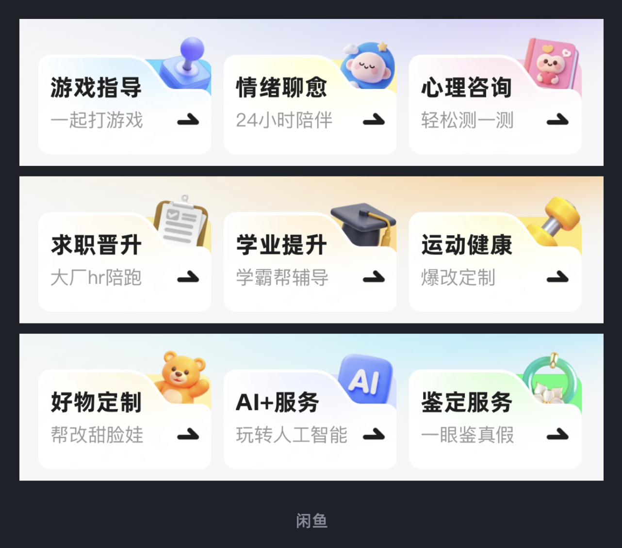 閑魚的副業(yè)模塊(如游戲指導(dǎo)、情緒聊愈、心理咨詢)采用 “異形卡片” 設(shè)計:每張卡片的右上角都做了凹陷處理,將功能圖標(biāo)嵌入凹陷處,形成 “卡片 - 圖標(biāo)” 的第一層關(guān)聯(lián);同時,每張異形卡片下方又疊加了一層淺色調(diào)的背景卡片,通過色彩深淺和輪廓差異,形成 “背景卡片 - 異形卡片 - 圖標(biāo)” 的三層結(jié)構(gòu)。這種設(shè)計不僅讓每個副業(yè)模塊的邊界更清晰,還通過 Z 軸層級的差異,避免了多模塊排列的呆板感,用戶能快速識別不同功能。