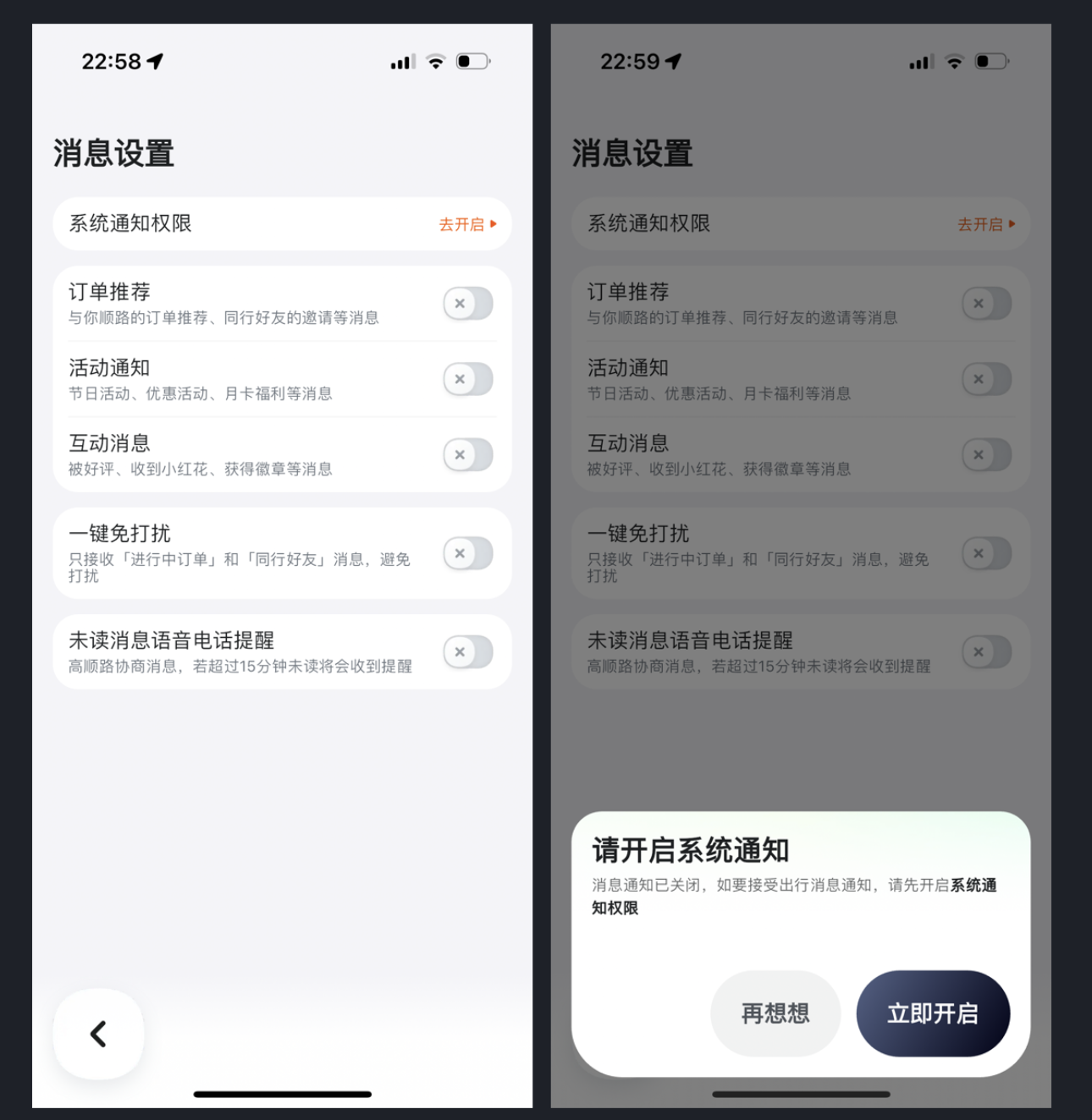 “引導(dǎo)用戶開啟系統(tǒng)通知” 是很多 APP 的剛需,但傳統(tǒng)設(shè)計多采用 “強(qiáng)硬引導(dǎo)”(如 “去開啟” 按鈕),忽略了用戶 “怕打擾” 的核心顧慮,反而導(dǎo)致用戶反感。嘀嗒出行的通知設(shè)置設(shè)計,卻用 “一鍵免打擾” 的選項,做到了 “產(chǎn)品需求” 與 “用戶體驗” 的平衡。