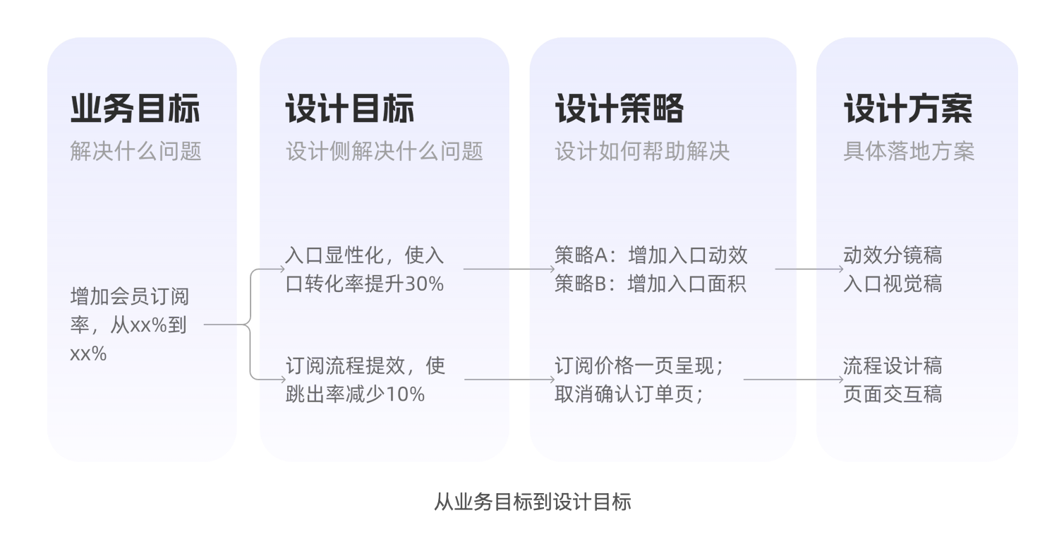 設計目標必須是 “設計側能獨立影響、可量化” 的指標。比如從 “提升訂閱率” 拆解出兩個設計目標:“會員入口點擊率提升 30%”“訂閱流程跳出率降低 20%”,這兩個指標能直接通過設計優(yōu)化實現(xiàn),也便于后續(xù)評估設計價值。