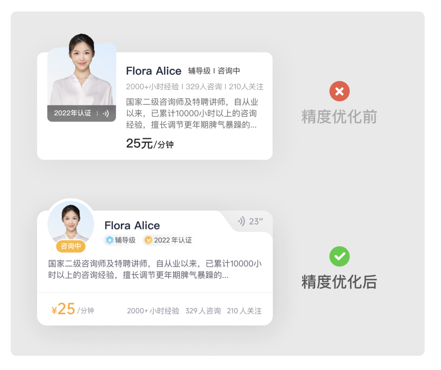卡片中的關(guān)鍵數(shù)據(jù)(如咨詢費(fèi)用、經(jīng)驗(yàn)時(shí)長(zhǎng)、咨詢?nèi)藬?shù))需要重點(diǎn)突出,但要避免多個(gè)視覺(jué)焦點(diǎn)沖突。可將費(fèi)用 “25 元 / 分鐘” 改為 “¥25 / 分鐘”,放大字號(hào)并加粗;其他數(shù)據(jù)保持統(tǒng)一字號(hào),用間距區(qū)分,讓用戶一眼就能捕捉到核心信息,提升決策效率。