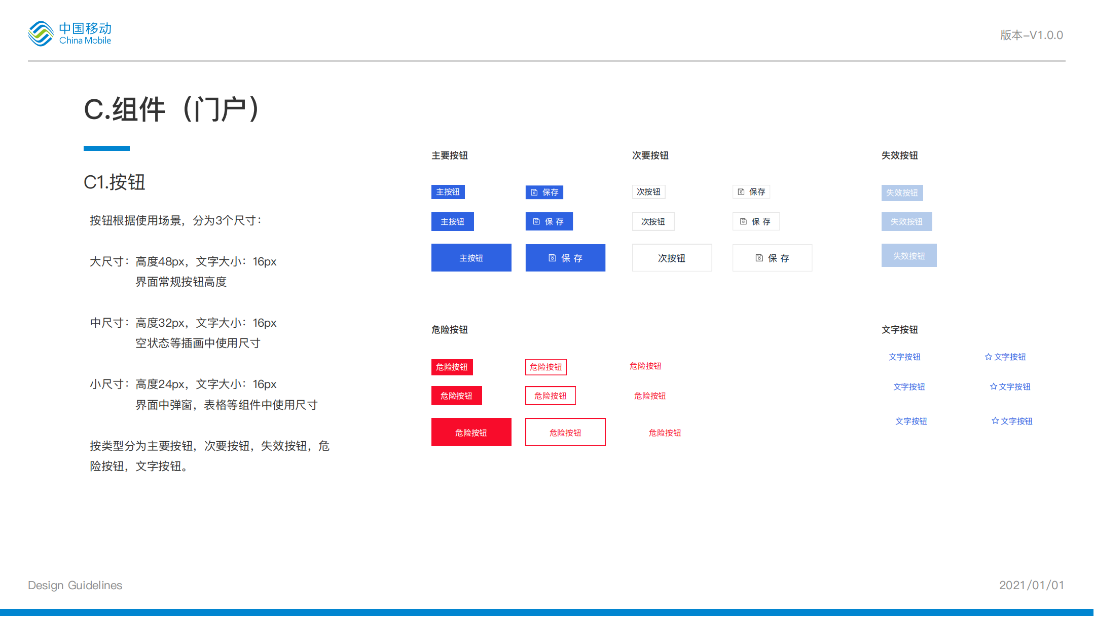 按鈕有 5 個(gè)狀態(tài):正常、點(diǎn)擊、懸停、加載、禁用。需要在規(guī)范中分別羅列出這五個(gè)狀態(tài),標(biāo)注上對應(yīng)的按鈕填充色、邊框色、圓角值、按鈕寬度和高度,按鈕文本大小、顏色值。如果是圖標(biāo)按鈕的話,除了上述參數(shù)值以外,還需要標(biāo)注 icon 和按鈕文本之間的間距,icon 圖標(biāo)的大小。
