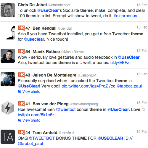 另外,如果你follow了Clear開發(fā)者的Twitter帳號(hào),那么還能獲取另外一款獎(jiǎng)勵(lì)主題。這個(gè)彩蛋的作用依然在于傳播。人們會(huì)分享他們的熱忱,甚至談?wù)撍麄儷@得或是錯(cuò)過了哪些主題。
