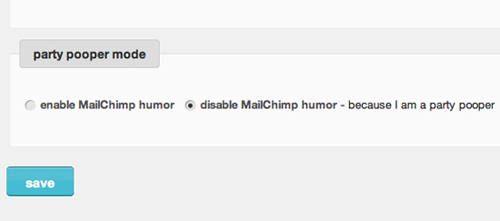 再次以MailChimp為例,他們提供了一種“party掃興模式”,那些對(duì)幽默風(fēng)格不感冒的用戶可以在這里禁用那些有意思的設(shè)計(jì)元素。