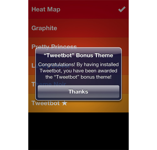 驚喜、專享 :在應(yīng)用中打開主題設(shè)置界面后,安裝了Tweetbod的用戶會(huì)收到一條消息,恭喜他們獲得了專享的額外主題。這些用戶很可能因?yàn)槭艿搅颂厥庹疹櫠械介_心,另外,這個(gè)群體在口碑傳播方面的作用是相當(dāng)大的。