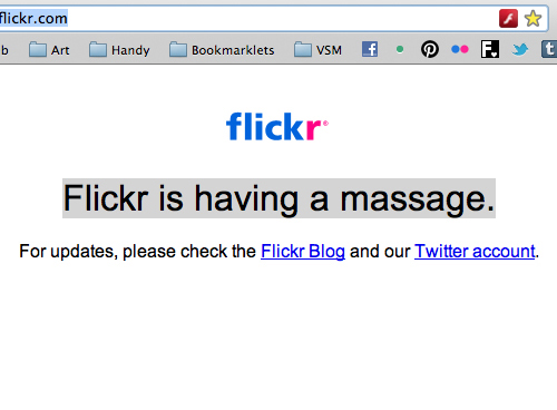 用戶在Flickr進(jìn)行系統(tǒng)維護(hù)或升級(jí)期間會(huì)看到"Flickr正在做按摩"的提示,如果有興趣的話還可以到他們的官方博客或是微博當(dāng)中查看當(dāng)前的具體狀況。這樣的文案比起簡單粗暴的出錯(cuò)提示來說更能讓用戶接受。