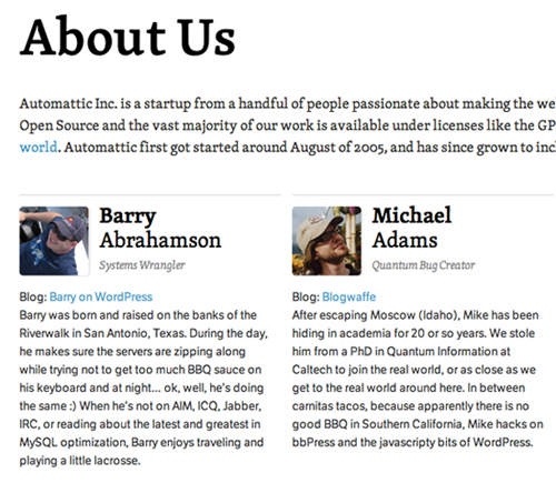 幽默 :在Automattic的“關(guān)于”頁面中充滿了和善幽默的自我介紹,感興趣的用戶在閱讀時(shí)就能感受到他們那種充滿樂趣的工作環(huán)境。