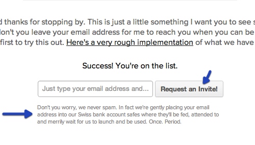 下面的范例來自我的一個(gè)個(gè)人項(xiàng)目,用戶需要邀請(qǐng)碼才可以試用這個(gè)產(chǎn)品。在提交申請(qǐng)的地方,我使用“我要獲取邀請(qǐng)!”來代替?zhèn)鹘y(tǒng)的“提交”作為按鈕當(dāng)中的文案,希望這可以調(diào)動(dòng)起用戶的情緒,并使他們感受到一種更加真實(shí)、更加有針對(duì)性的互動(dòng)。另外我也起草了一份簡單的說明文案,讓用戶放心,我們絕不會(huì)發(fā)送垃圾郵件。