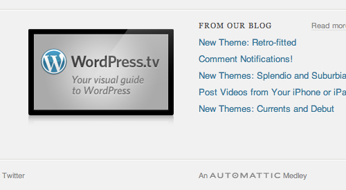 文案 :在wordpress.com首頁的頁腳當(dāng)中有一段每次加載頁面都會(huì)發(fā)生變化的簽名語,有時(shí)是“來自Automattic的產(chǎn)品”,有時(shí)變?yōu)?ldquo;來自Automattic的樂章”。這種細(xì)節(jié)體現(xiàn)了他們對(duì)于自己產(chǎn)品的熱愛。