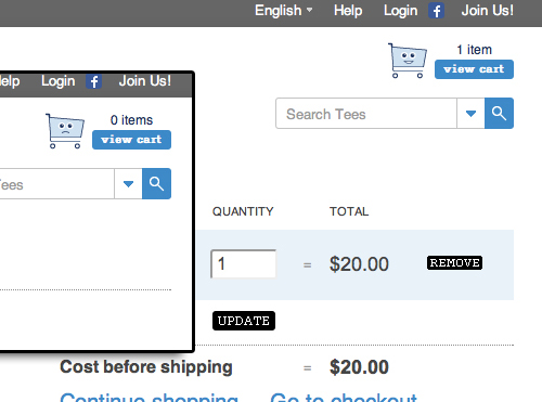 Threadless 的購物車在沒有商品放入時(shí)會(huì)呈現(xiàn)出憂傷的表情,反之則會(huì)表現(xiàn)的非常開心。這樣的小細(xì)節(jié)會(huì)讓你覺得平凡而有趣,甚至?xí)挥勺灾鞯男ζ饋?。即使用戶最終沒有產(chǎn)生購物行為,他們也會(huì)記住這個(gè)可愛的購物車。