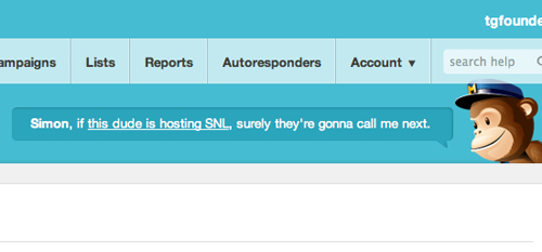 MailChimp 在情感化設(shè)計(jì)方面的一個(gè)特色之處就是他家的吉祥物,猩猩Freddie。這家伙會(huì)在你的個(gè)人資料頁打開之后為你歡呼,而且每次刷新頁面之后都會(huì)冒出一些隨機(jī)的笑話或鏈接。