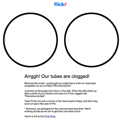 同樣來自于Flickr的案例。當(dāng)系統(tǒng)發(fā)生了一些更加嚴(yán)重的問題時(shí),他們會(huì)告訴用戶:“額,我們的管道堵塞了!”,然后使用非??谡Z化的文案表示了歉意。除此之外,他們還為用戶設(shè)置了一個(gè)小任務(wù),也就是將當(dāng)前頁面打印出來,為兩個(gè)圓環(huán)填色,然后拍下來,等到站點(diǎn)恢復(fù)正常后傳到Flickr上;Flickr團(tuán)隊(duì)會(huì)挑選出優(yōu)勝者,向他們贈(zèng)送一年的高級(jí)帳號(hào)。
