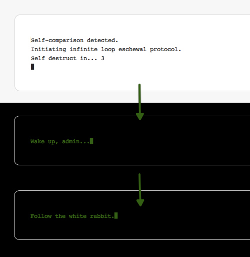 彩蛋 :在WordPress的self-comparison當(dāng)中有個(gè)彩蛋。為了防止相同版本的文章進(jìn)行自我比較,Automattic創(chuàng)建了一個(gè)小機(jī)制,無論是其中的文案還是視覺風(fēng)格都模仿了黑客帝國當(dāng)中的段子。這篇文章 會(huì)教你怎樣在WordPress當(dāng)中找到這個(gè)彩蛋。