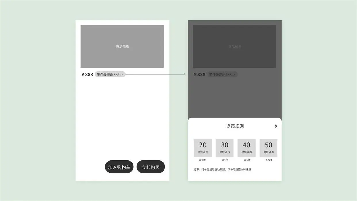 乍一看該功能都不需要設(shè)計(jì)師參與,只需要根據(jù)商品的返虛擬幣規(guī)則,將之前的單件反幣標(biāo)識(shí)改成多個(gè)就行,如“1 件返 XX、3 件返 XX…”,雖然看起來(lái)好像也解決了業(yè)務(wù)訴求,但是如果僅僅考慮標(biāo)識(shí)展示,而不結(jié)合需求背后的業(yè)務(wù)邏輯去思考,后續(xù)也會(huì)隨著規(guī)則的變化而帶來(lái)對(duì)應(yīng)的問(wèn)題,那對(duì)于交互與UI設(shè)計(jì)師而言,針對(duì)這個(gè)需求,又該如何考慮的呢?我將分為“交互篇”與“UI篇”來(lái)分別闡述。