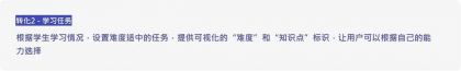 這點(diǎn)轉(zhuǎn)化到教育產(chǎn)品側(cè),為學(xué)生提供教學(xué)內(nèi)容的學(xué)習(xí)目標(biāo)就尤為重要,有方向的學(xué)習(xí)更有效率。