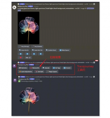 Tracejourney 還可以和 Midjourney 配合使試用。設(shè)置完成后,當(dāng)我們放大 Midjourney 圖像時(shí),底部會(huì)自動(dòng)彈出 Tracejourney 的工具欄,點(diǎn)擊對(duì)應(yīng)的按鈕就能輕松對(duì)圖片進(jìn)行處理。點(diǎn)擊鏈接查看具體設(shè)置教程: https://www.uisdc.com/5-ai-tools-2 。