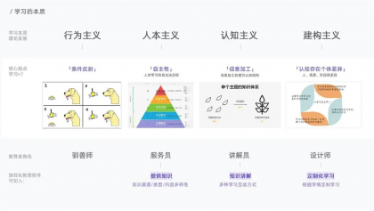 學(xué)習(xí)本質(zhì)的理論基礎(chǔ)經(jīng)過(guò)了 4 個(gè)時(shí)期的發(fā)展,從行為主義、人本主義、認(rèn)知主義再到建構(gòu)主義,對(duì)于教育者/方的要求越來(lái)越高。