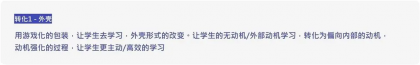 從這個(gè)理論來(lái)看,我們的第一個(gè)轉(zhuǎn)化是“外殼”。用游戲化的包裝,讓學(xué)生去學(xué)習(xí),外殼形式的改變。讓學(xué)生的無(wú)動(dòng)機(jī)/外部動(dòng)機(jī)學(xué)習(xí),轉(zhuǎn)化為偏向內(nèi)部的動(dòng)機(jī),動(dòng)機(jī)強(qiáng)化的過(guò)程,讓學(xué)生更主動(dòng)/高效的學(xué)習(xí)。
