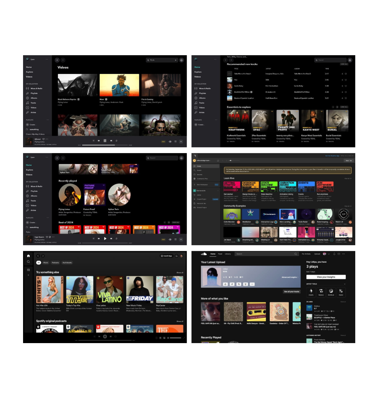 • 深色模式優(yōu)先:黑色或深灰背景,能凸顯封面、模塊卡片、圖標(biāo)的亮色部分,視覺上更聚焦內(nèi)容。