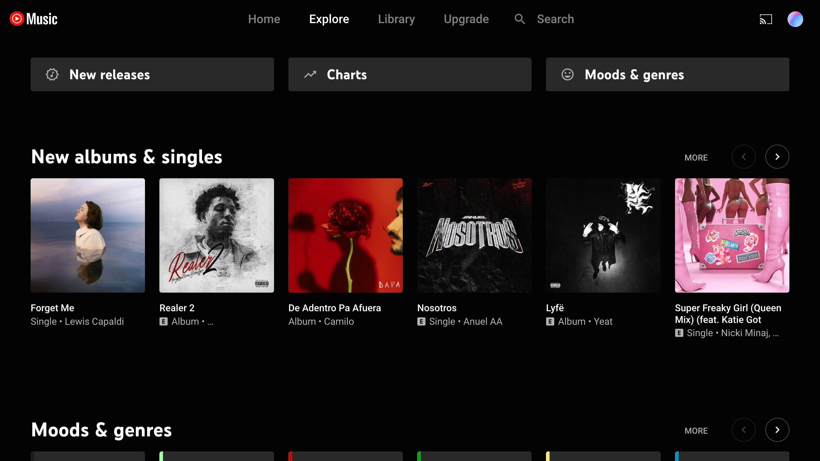 • 頂部導(dǎo)航欄:固定在頂部,放置核心功能入口(Home、Explore、Library、Search)。